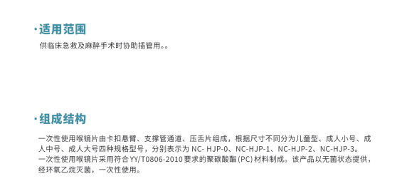 一次性使用喉鏡片由卡扣懸臂、支撐管通道、壓舌片組成。根據(jù)尺寸不同分為兒童型、成人小號、 成人中號、成人大號四種規(guī)格型號,分別表示為 NC-HJP-0、NC-HJP-1、NC-HJP-2、NC-HJP-3.
