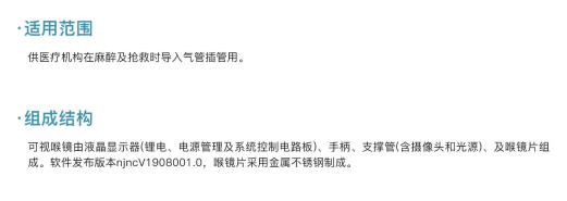 可視喉鏡由液晶顯示器(鋰電、電源管理及系統(tǒng)控制電路板)、手柄、支撐管(含攝像頭和光源)、及喉鏡片組成。軟件發(fā)布版本njncV1908001.0,喉鏡片采用金屬不銹鋼制成。產(chǎn)品供醫(yī)療機(jī)構(gòu)在麻醉及搶救時(shí)導(dǎo)入氣管插管用。
