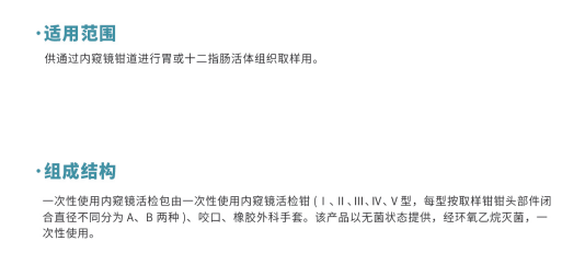 一次性使用內窺鏡活檢包由一次性使用內窺鏡活檢鉗(Ⅰ、Ⅱ、Ⅲ、Ⅳ、Ⅴ型,每型按取樣鉗鉗頭部件閉合直徑不同分為 A、B 兩種)、咬口、橡膠外科手套。